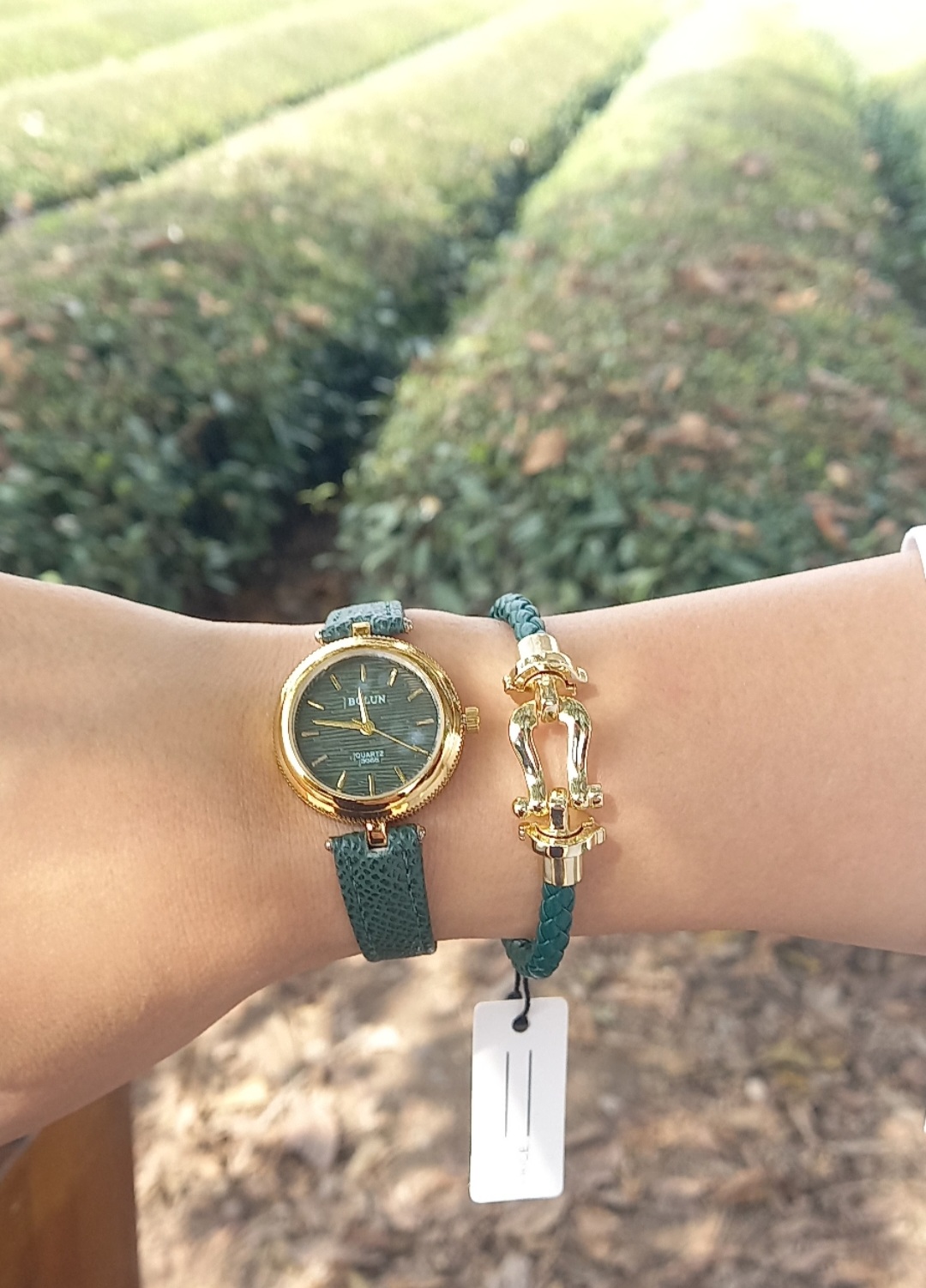 ساعت زنانه بند چرم سبز رنگ بلون کیفیت چرم بسیار خوب کیفیت موتور خوب جعبه زیبای جهت هدیه ساعت سبز زنونه چرم خاص