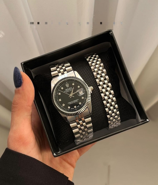 ست ساعت و دستبند رولکس مردانه سیلور ( نقره ای )
