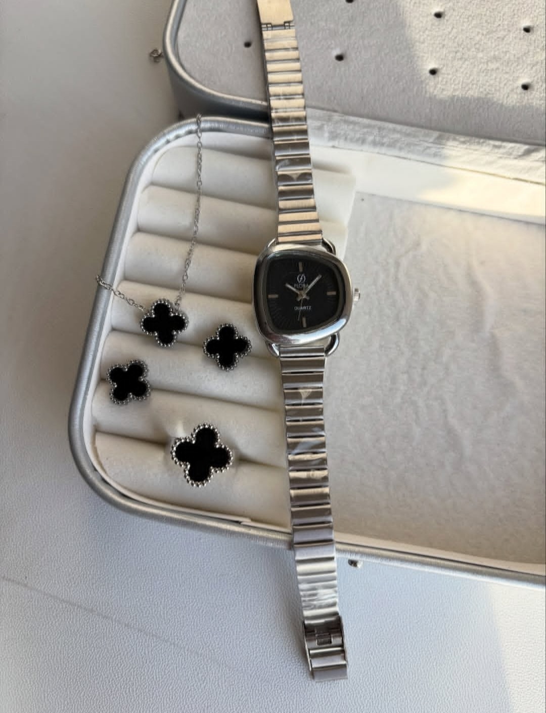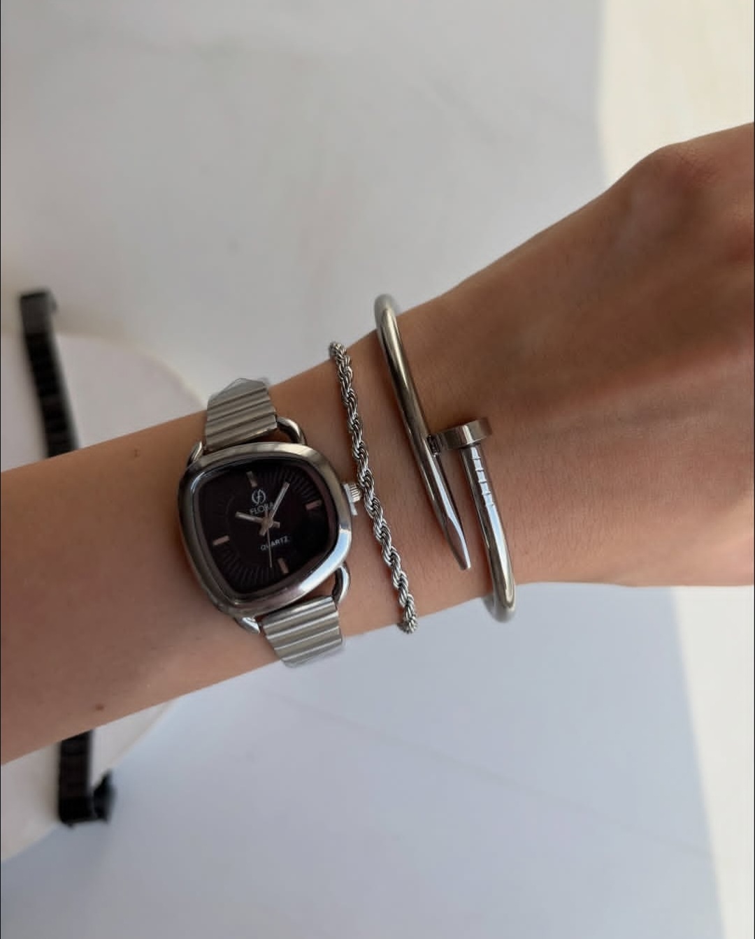 ساعت مچی دفرمه زنانه نقره ای صفحه مشکی استیل رنگ ثابت ضد حساسیت موتور با کیفیت عالی بند ریلی شیک قفل و بند سایز شونده با مج دارای جعبه شیک مناسب انواع استایل