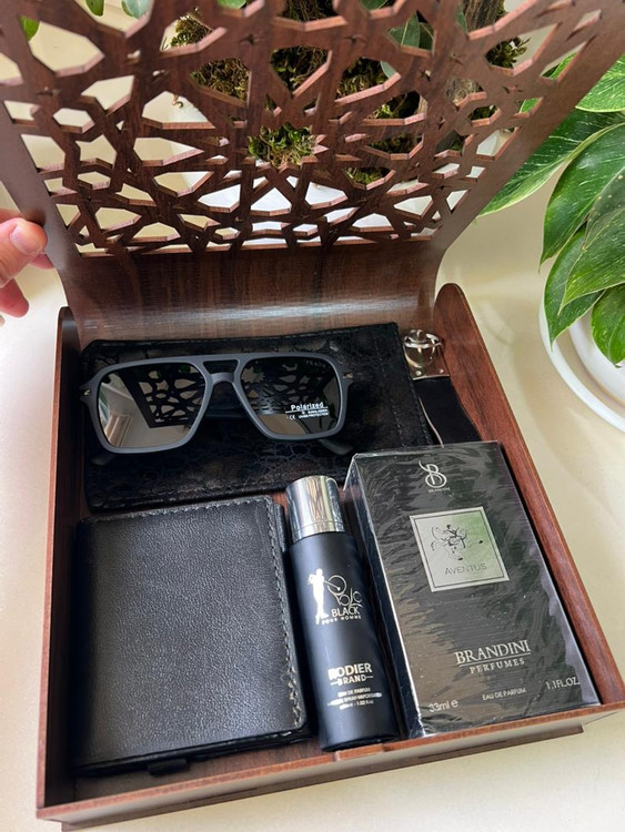 باکس هدیه مردانه ۵ تکه با جعبه شیک چوبی