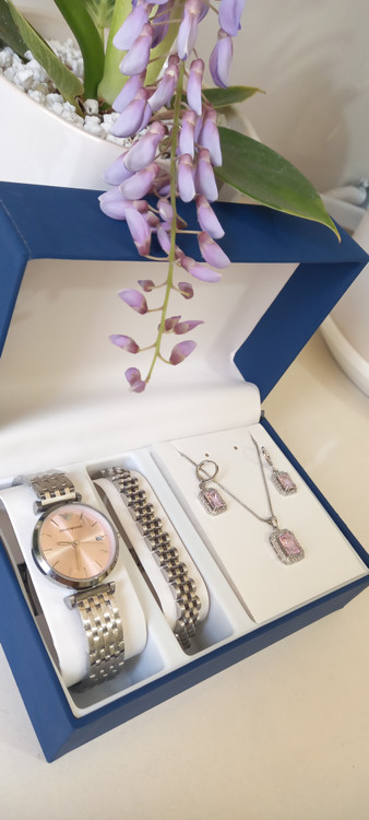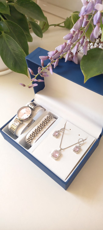 ست ساعت دستبند نیمست نقره ای صورتی شامل