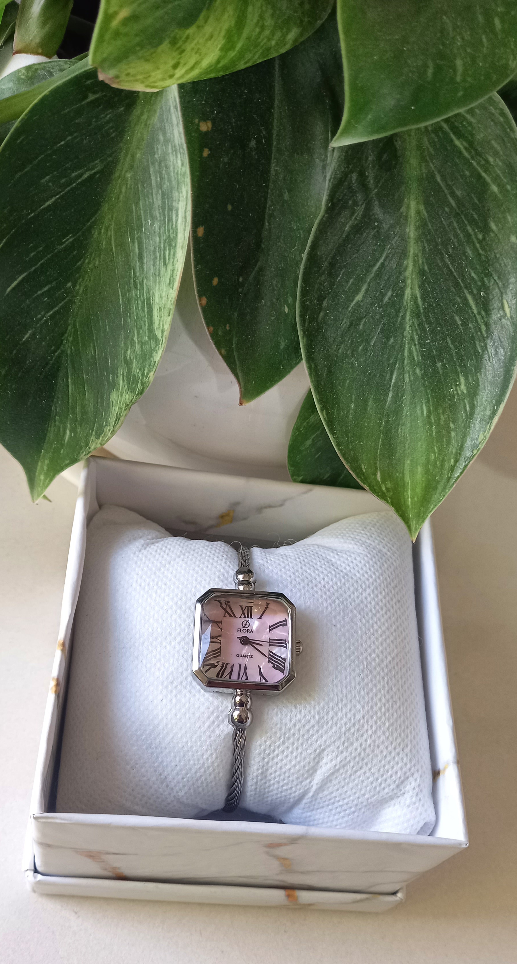ساعت مچی زنانه بنگلی دستبندی نقره ای صفحه مربع یونانی استیل رنگ ثابت ضد حساسیت موتور با کیفیت فری سایز دارای جعبه مناسب برای انواع استایل اسپرت و هم رسمی ساعتی بسیار خاص و شیک